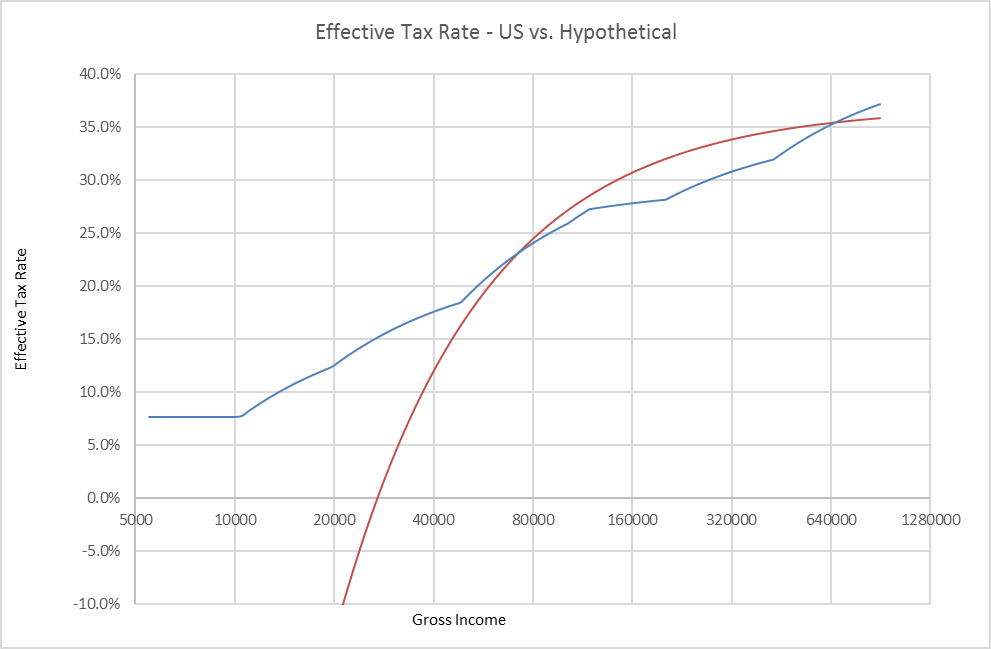 The effective tax rate calculated from these bands is plotted on the graph in blue, against a curve in red showing the effective tax rate given by a Universal Basic Income of $10,000 per annum, and a flat tax of 37% on all earned income: