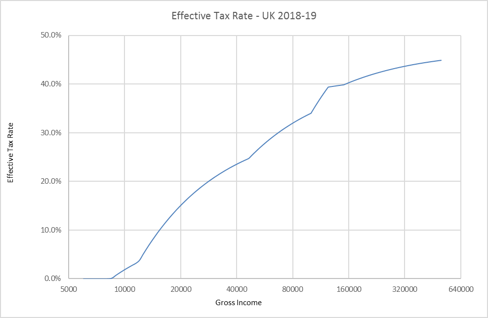 The gross income is the amount paid before tax, and the impact of the thresholds mentioned above, mean that someone earning £20,000 per year will pay £3,022 in tax, for an effective tax rate of 15.1%, while someone earning £80,000 will pay £25,587 in tax, for an effective tax rate of 32.0%. The strange kinks in the line are a direct result of the discontinuities in the tax bands, but the intention is clear – to tax higher earners at a higher rate than lower earners, this being the definition of a progressive tax.