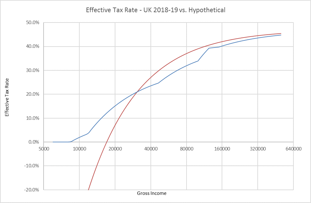 The results of the UK income tax code are shown as a blue line on the graph below (plotted on a logarithmic x-axis – doubling with each successive gridline rather than increasing a fixed amount, so that it is easier to see the detail):