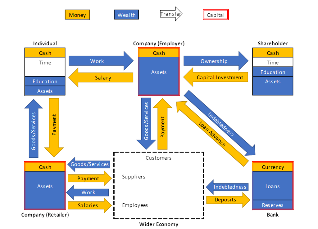 Many businesses rely on a steady influx of cash, and cannot survive for long if this is disrupted (as we have seen during the recent pandemic related economic crisis). This is usually due to staffing costs and loans - layoffs are unpopular and re-recruitment is costly, whilst loans cannot be avoided without declaring bankruptcy or liquidating assets to repay them. Therefore if the flow of money around the economy slows down companies with high leverage or many staff will be the first to downsize or fail. Again though, QE is a policy that simply aims to increase the speed at which money changes hands - it doesn’t create wealth out of nothing, as using these definitions money is not wealth.