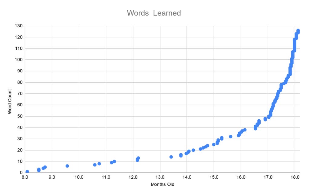As you can see from the above graph, word acquisition tracked pretty close to exponential. While we stopped tracking individual words at about 18 months, because they were coming too rapidly to keep track, this trend has continued.