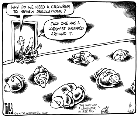 Often regulations are put in place that benefit incumbent companies or introduce barriers to entry for newcomers (e.g. state hairdresser licenses in the US). Even regulations that at first glance seem costly to existing companies can be beneficial to them, by maintaining a bureaucracy that is difficult for new market entrants to navigate. They will fight to preserve any barrier to entry that protects their turf.