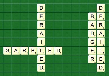 The Scrabble conflict I am most familiar with is the one that arises between serious players and occasional players. By serious, I don't mean people that compete at an international level or anything like that; I just mean people that are competitive - the aforementioned optimisers. It is possible to deduce fairly quickly that knowing all permissible 2-letter words gives you a huge advantage over anyone that doesn't - being able to play words parallel rather than perpendicular to those already on the board increases the availability of high scoring plays enormously. For example, if DERAILED is already on the board, we can play the hand ABEGKDR in a couple of very different ways. Before any bonuses are taken into account, playing letters parallel to the existing word already scores more than double playing them perpendicular: