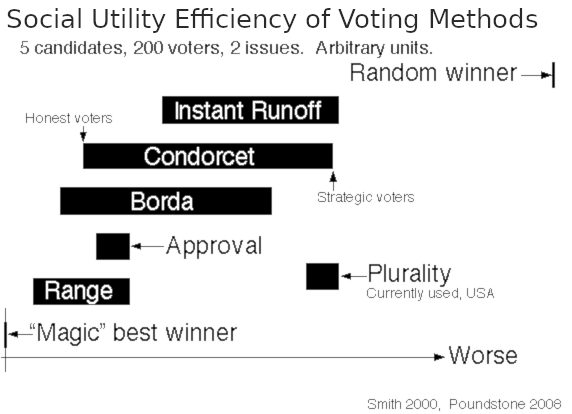 All of this makes these methods significantly more reliable than most other voting methods for actually capturing the preferences of the populace. The graph below shows the hypothetical outcomes of 144 simulated elections, where the outcome is measured by the average satisfaction the electorate has with the election winner (known as the Social Utility Efficiency or Voter Satisfaction Efficiency):