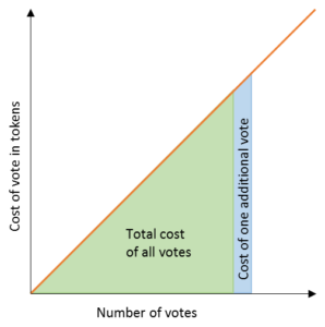If only one of the 10 issues was one that a particular voter cared about, they could spend all 10 of their tokens buying votes for that particular issue. This would buy a total of 4 votes - 1 token for the first vote, 2 for the second, 3 for the third and 4 tokens for the fourth, for a total of 10 tokens. For those arithmetically inclined, you may notice that this means that buying n votes costs Tn tokens, where Tn is the nth Triangular number. The formula for calculating this is [latex]\small T_{n}=\frac{n(n+1)}{2}=\frac{n^{2}+n}{2} [/latex] which is where the "quadratic" in the name comes from (in fact this is functionally equivalent to a system where n votes costs n2 tokens, but this is less natural to explain than "the nth vote on the same issue costs n tokens").